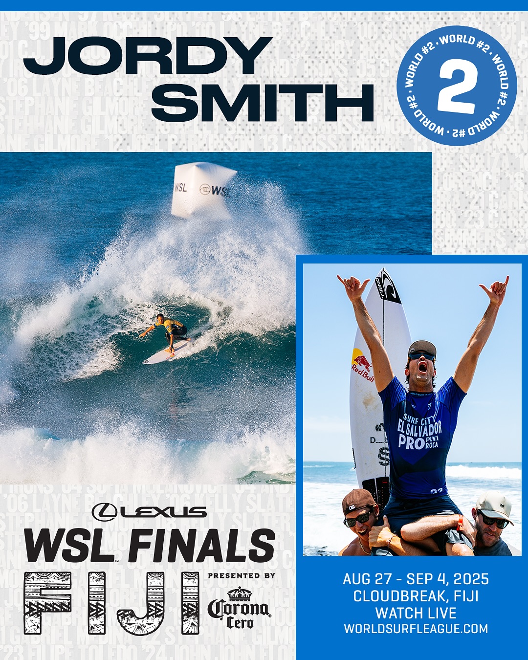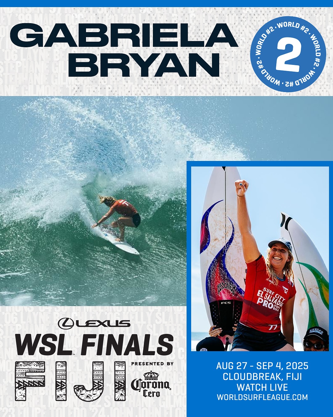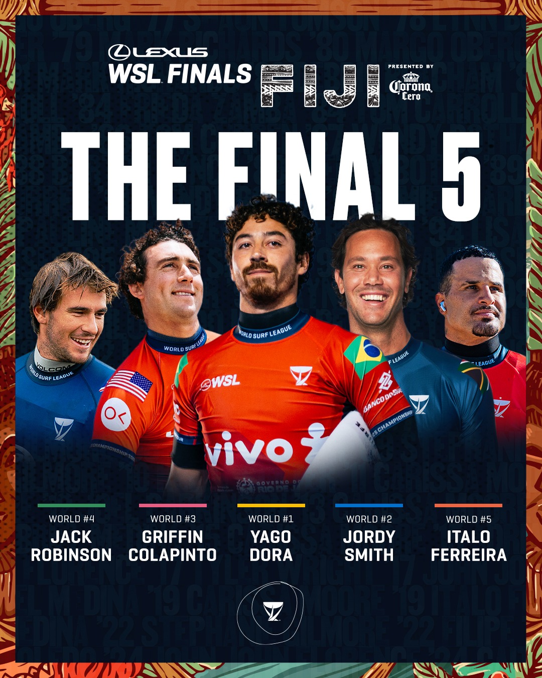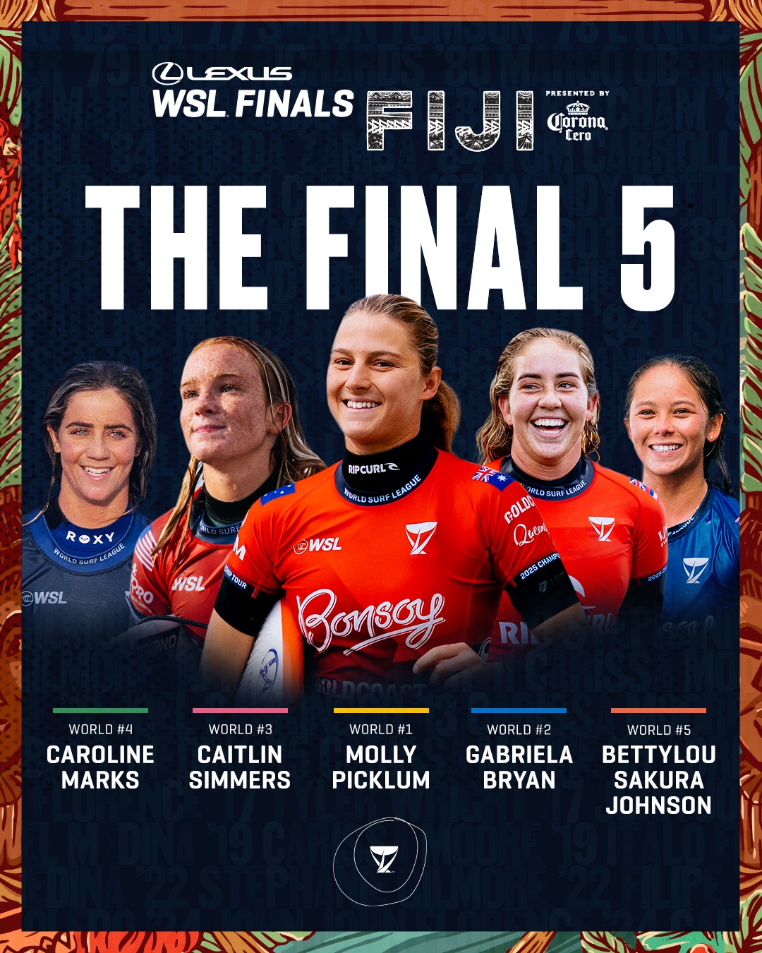 レクサスWSLファイナルズ フィジー プレゼンテッド バイ コロナ セロは、2025 WSL ワールド・チャンピオンシップ・ツアーの最終戦であり、トップ 5 の男子選手とトップ 5 の女子選手が 2025 年の世界タイトルを争う。