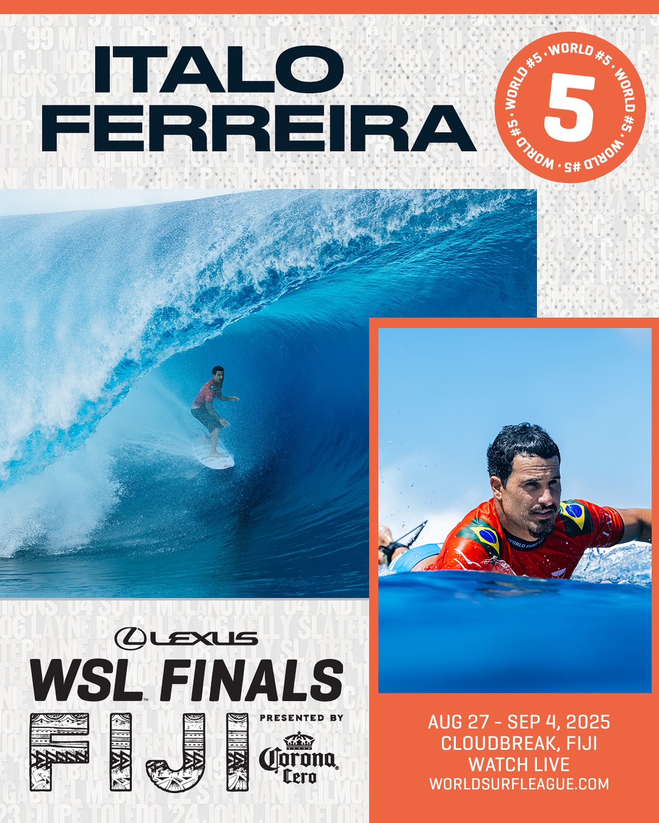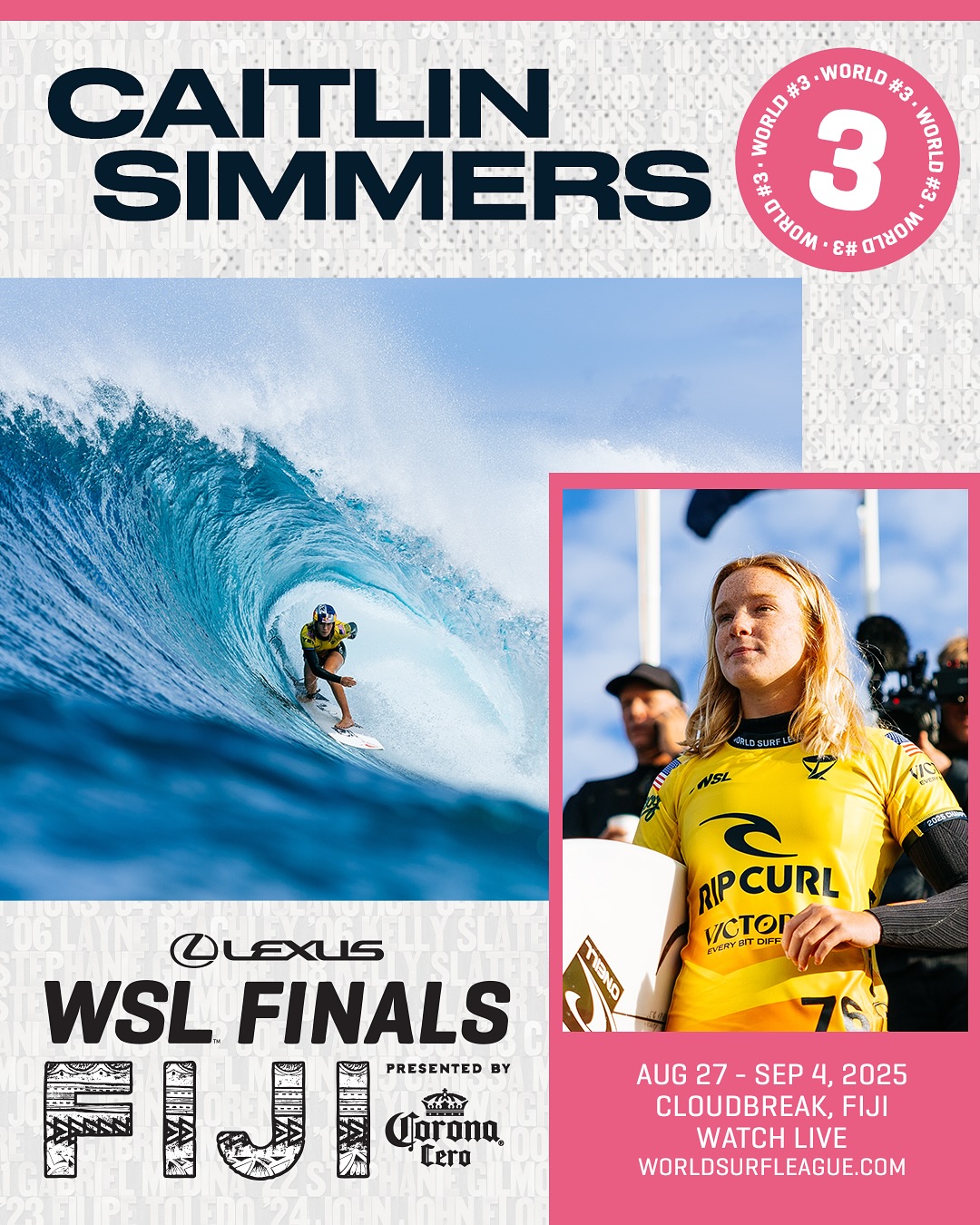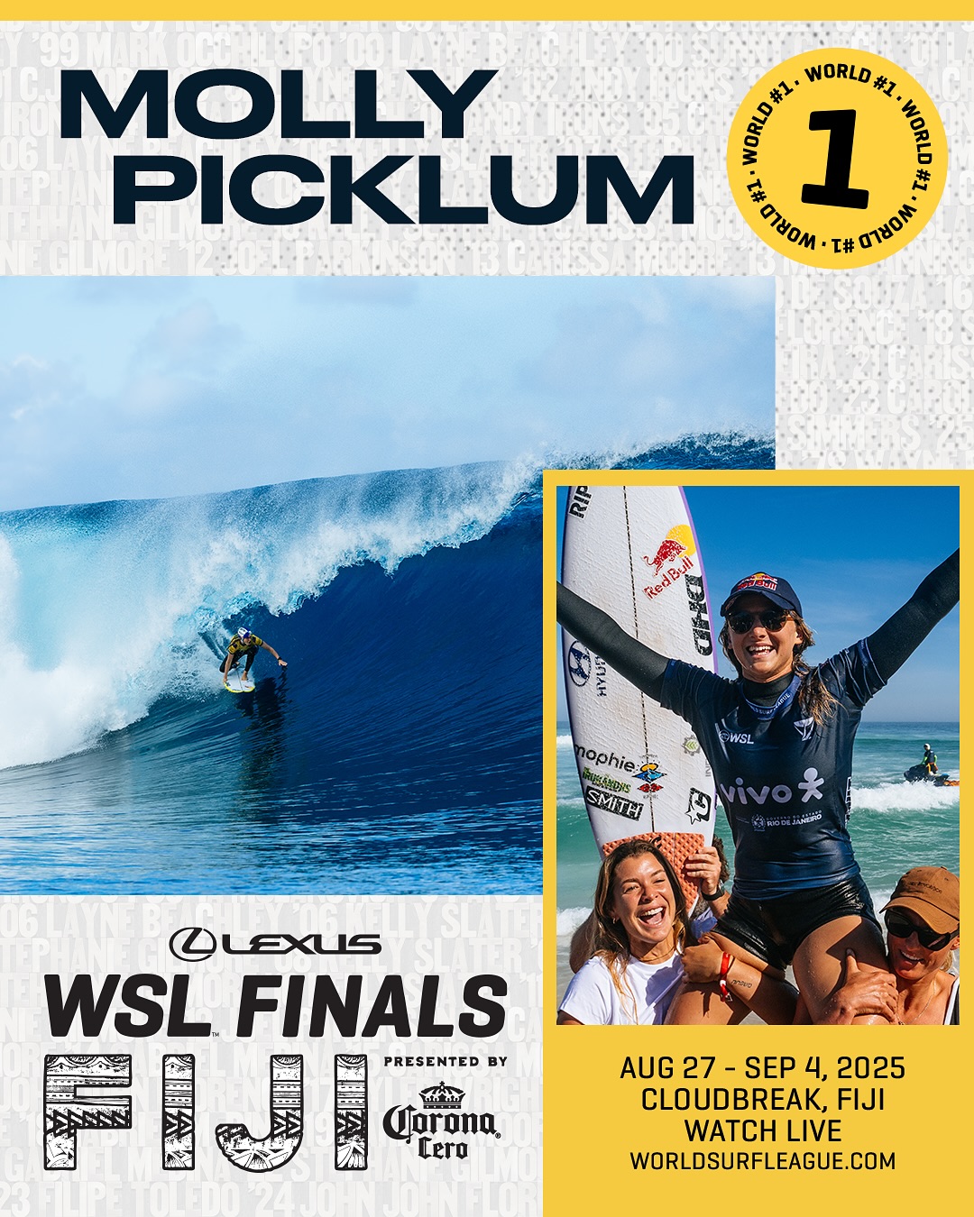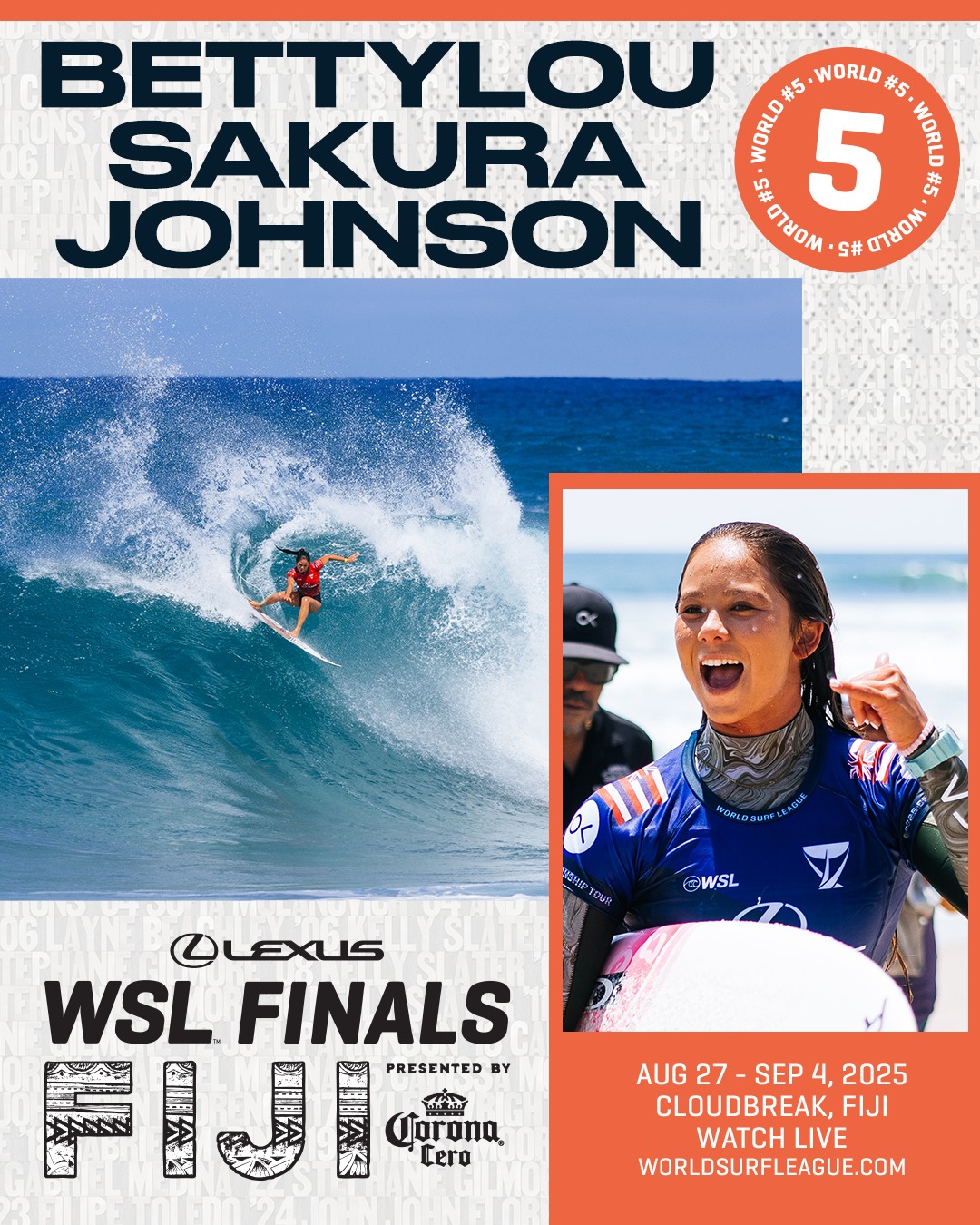 レクサスWSLファイナルズ フィジー プレゼンテッド バイ コロナ セロは、2025 WSL ワールド・チャンピオンシップ・ツアーの最終戦であり、トップ 5 の男子選手とトップ 5 の女子選手が 2025 年の世界タイトルを争う。