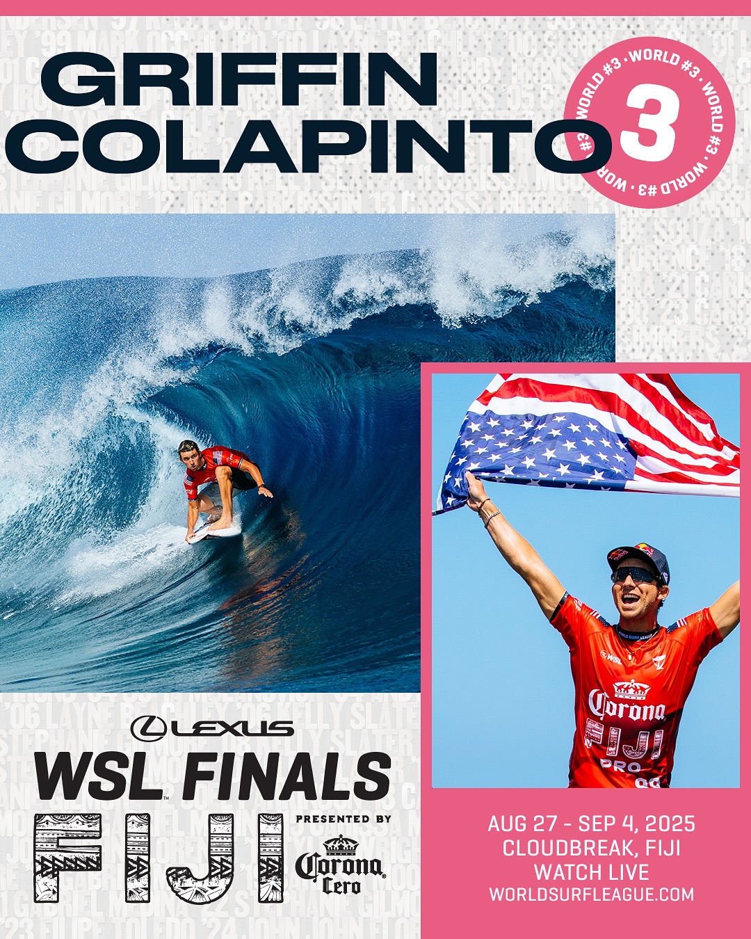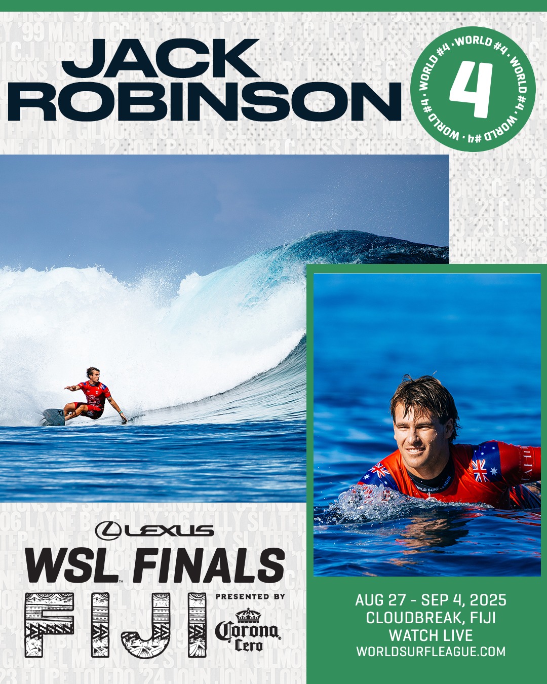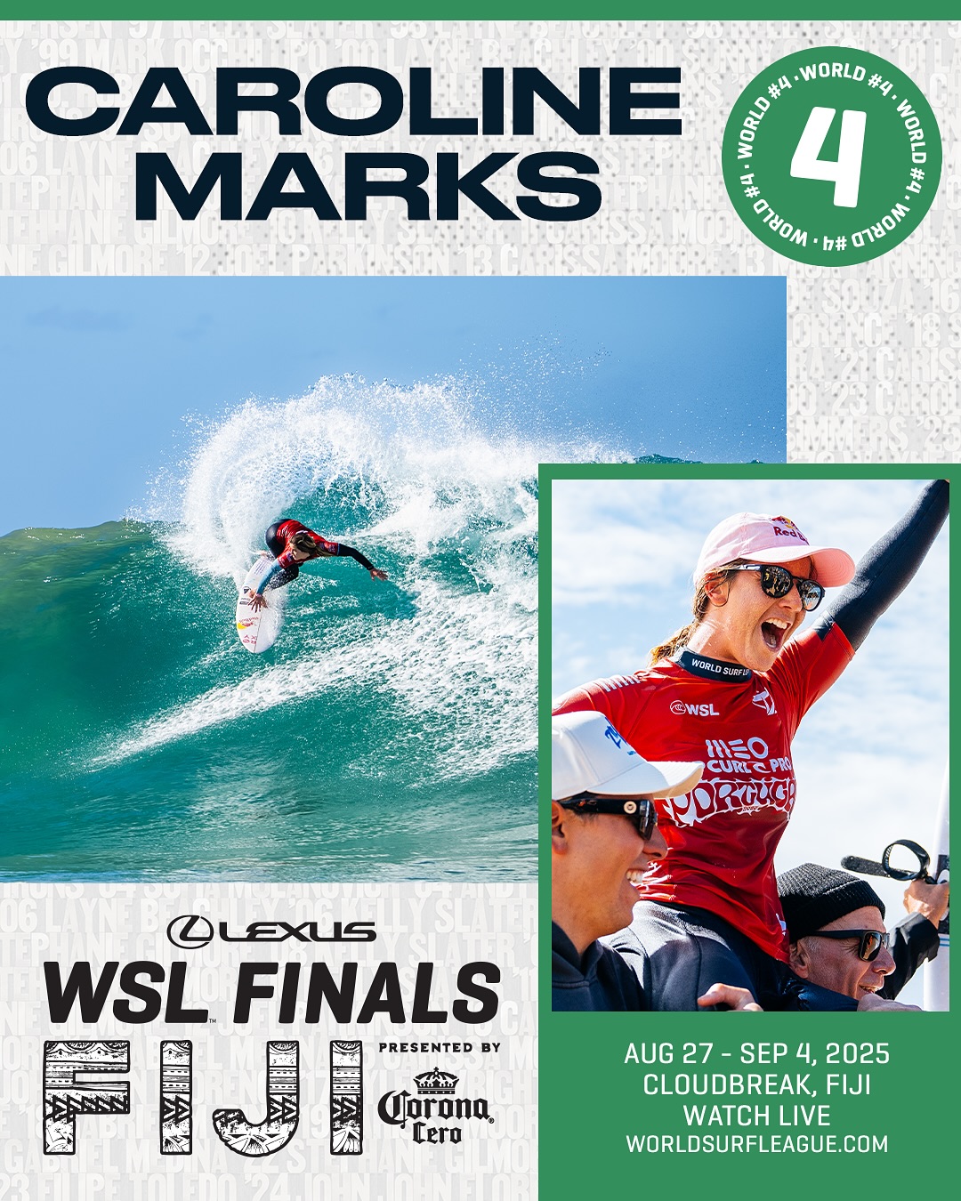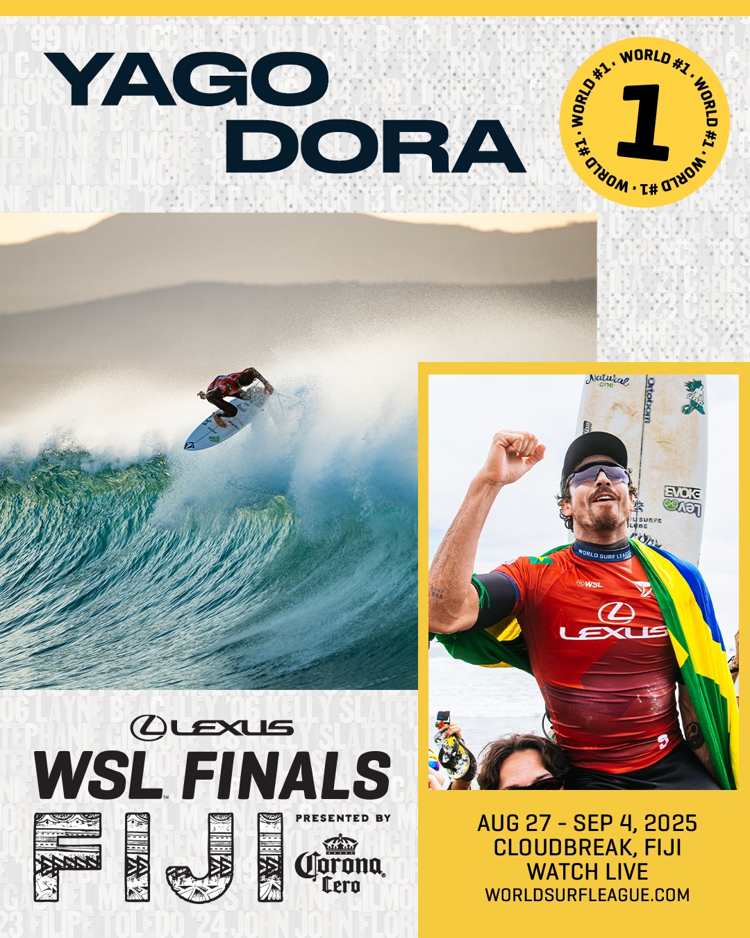 レクサスWSLファイナルズ フィジー プレゼンテッド バイ コロナ セロは、2025 WSL ワールド・チャンピオンシップ・ツアーの最終戦であり、トップ 5 の男子選手とトップ 5 の女子選手が 2025 年の世界タイトルを争う。