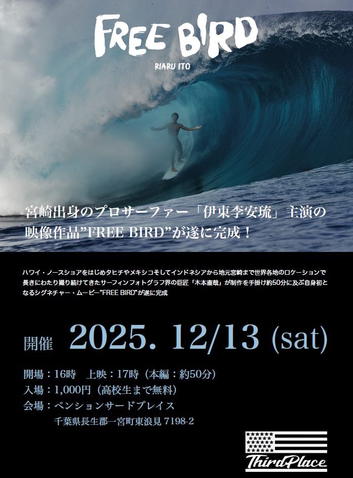 ハワイ・ノースショア、タヒチ、メキシコ、インドネシア、そして地元・宮崎まで、世界各地のロケーションを収めた映像を50分に凝縮。伊東李安琉にとって自身初となるシグネチャーフィルム「FREE BIRD」。その迫力ある映像世界を、ぜひ会場で体感してほしい。