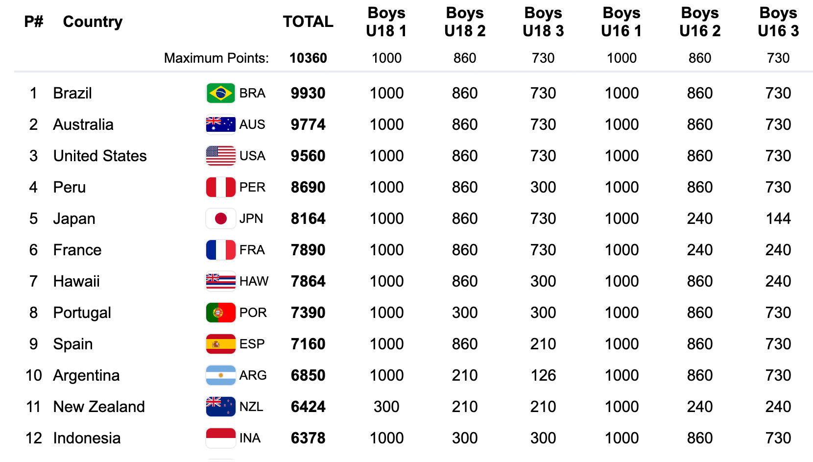 前回銀メダリストのハワイは、合計 18 個のチームメダルを獲得し、最多のオーストラリアに 1 個差と迫っている。今日は 7 位に順位を落としたものの、4 度のチーム世界チャンピオンは、大会が終盤に差し掛かる中、依然として強さを維持している。