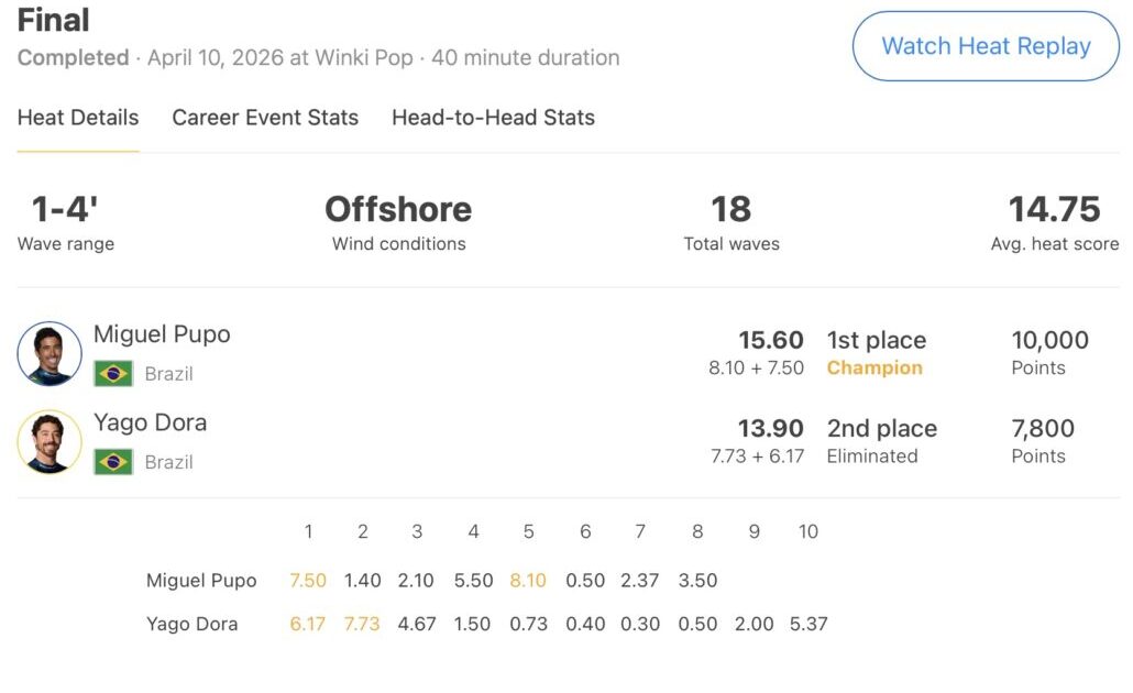 リズミカルにセットの波を掴んでヒート前半にトータルスコア15.00ptをまとめ上げたGriffin Colapintoに対し、プライオリティーを持って掴んだセットの波でテイクオフ・ポジションが深過ぎてしまったりと、海とのリズムを合わせることができなかった五十嵐カノア。